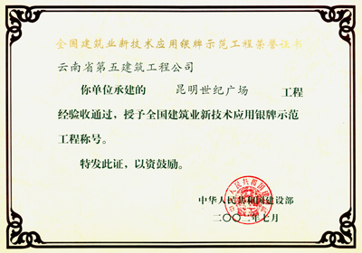 世紀(jì)廣場銀牌示范工程證書